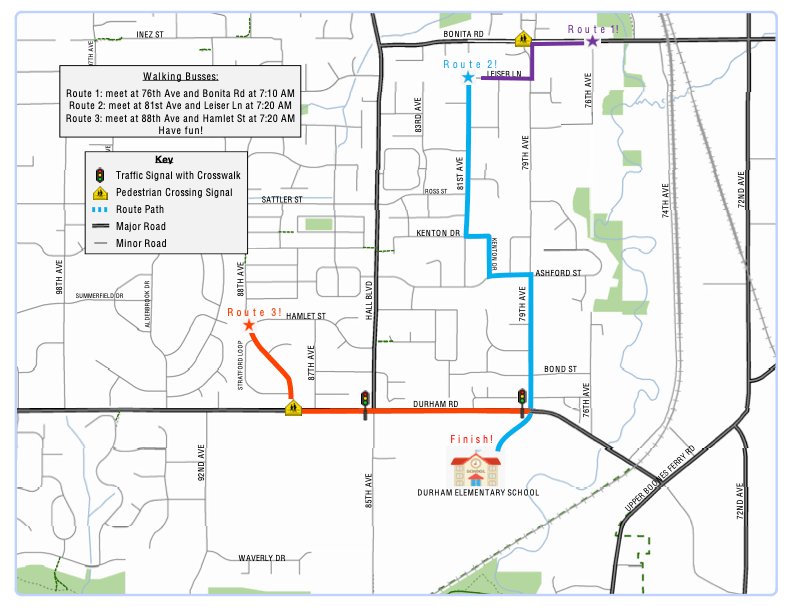 Join Mrs. Brewer and Mrs. Miller and the some special guests and walk or bike to school! You can start from one of the three walking routes listed below, or just come from your house. All students who participate will receive prizes from the City of Tigard. The Tigard school with the most participation will receive the GOLDEN SNEAKER AWARD from the City of Tigard! Durham won this award in October of 2018 AND April of 2019! Let’s show them AGAIN that Roadrunners are the best!!